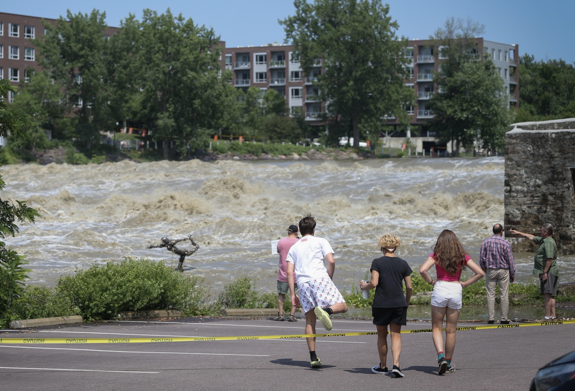 Onlookers observe a swollen Winooski River in Winooski, Vermont July 11, 2023 after historic flooding battered the state.